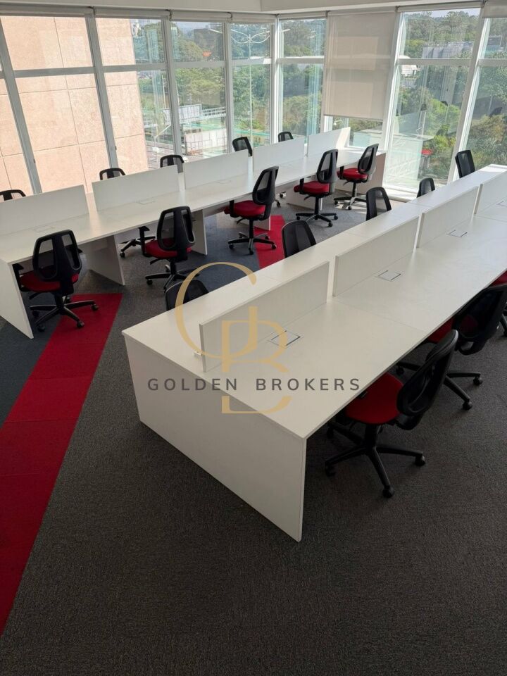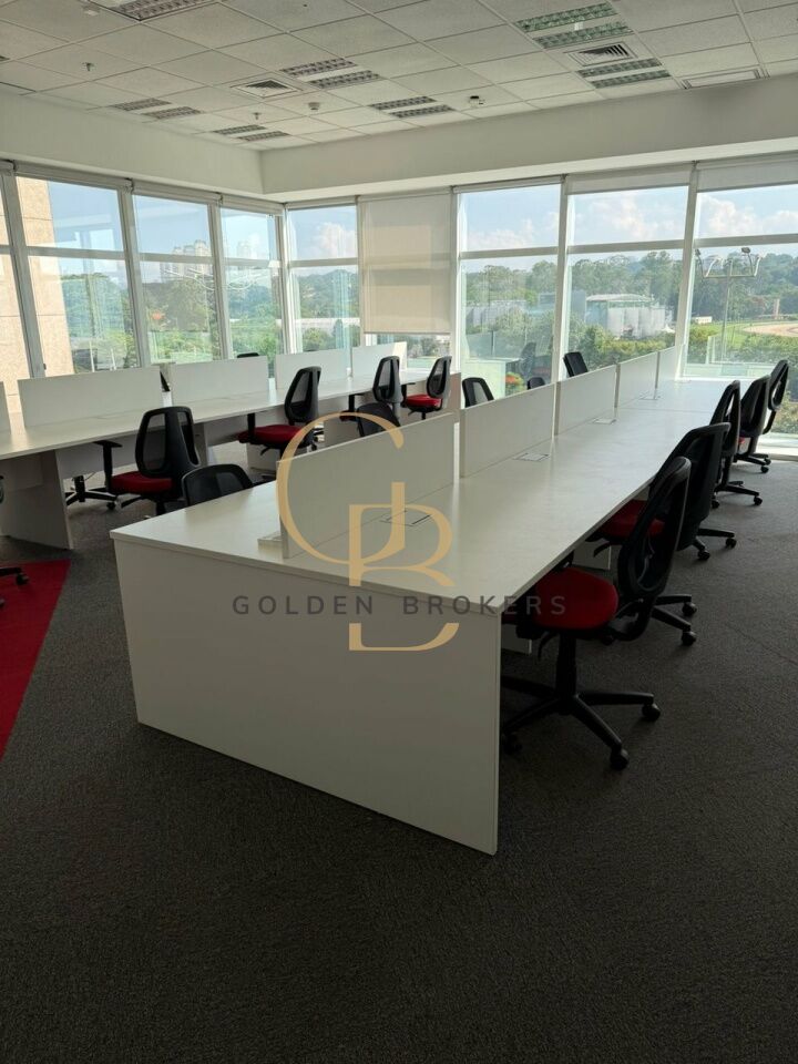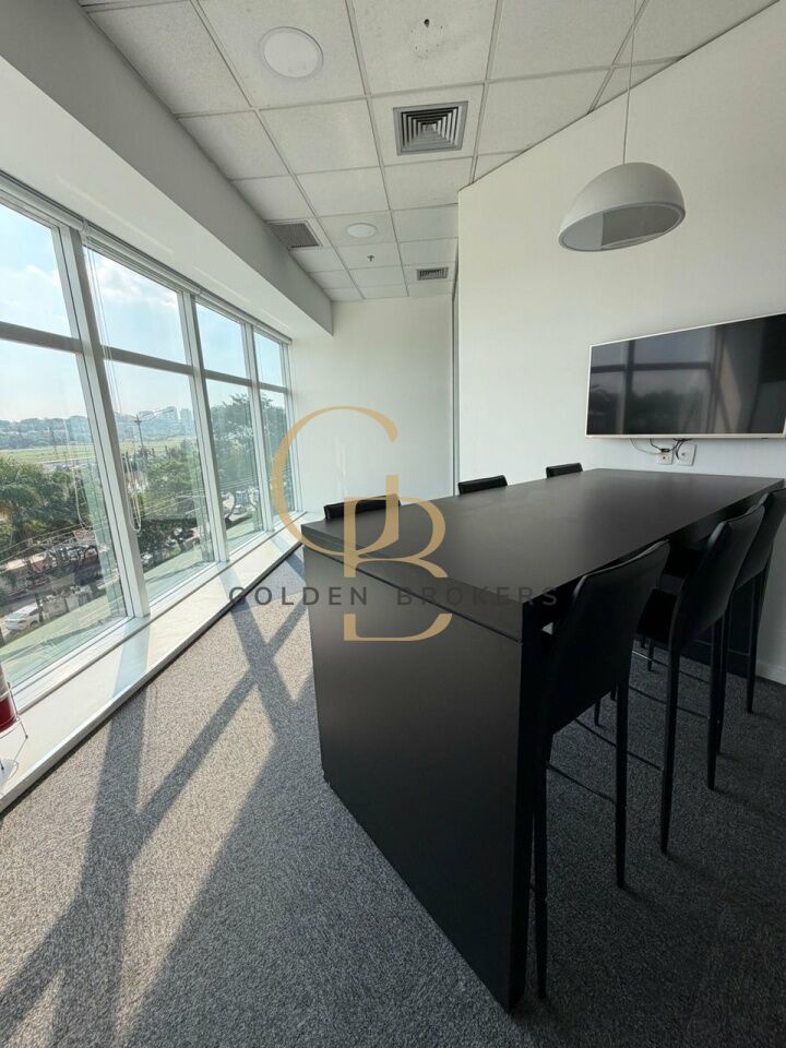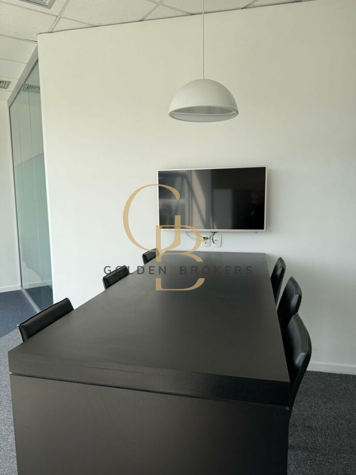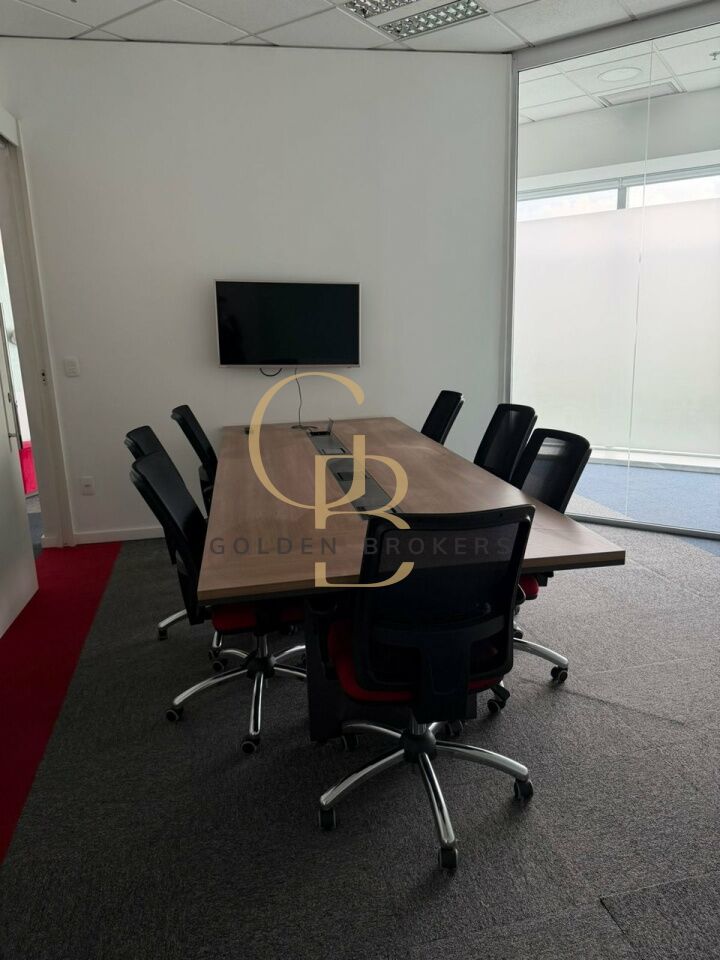Conjunto comercial com 158,40 m² de a.u, (mobiliado) com 20 posições de trabalho, 1 espaço aberto para reunião com 6 cadeiras e 1 sala de reunião com 9 cadeiras. 5 vagas de garagem.